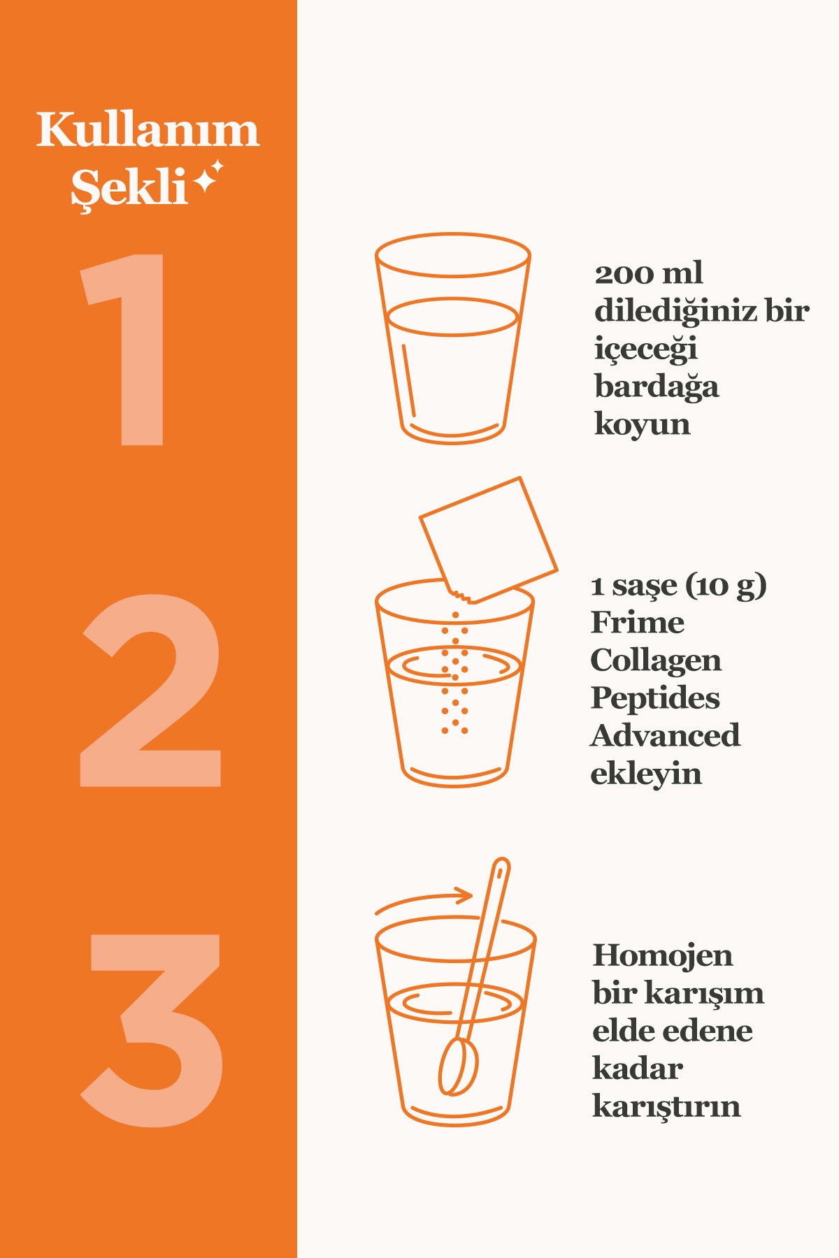 • Doğal Kolajen Peptidleri içeren Frime Collagen Peptides, cilt, saç, tırnak, kas ve kemik yapılarını destekler. • İçeriğindeki C Vitamini, Hyalüronik Asit ve Biotin sayesinde cilt, saç ve tırnak sağlığınıza üstün bir destek sağlar. • Hyalüronik Asit cildin nemli kalmasına destek olarak cilt elastikiyetini arttırır, kırışıklıkların azalmasına, cildinizin güçlenmesine ve gençleşmesine destek olur. • Koenzim Q10 ise UV ışınlarının neden olduğu oksidatif hasarı azaltarak cildin korunmasına yardımcı olur. • Biotin, keratin oluşumunu destekleyen önemli bir vitamindir. Keratin kırılan tırnaklarınızı güçlendirmek ve saçlarınızın sağlığını desteklemek için ideal bir seçenektir. • Kolajen kas eklem ve kemik sağlığını destekler, hareket kabiliyetinizi artırır ve spor performansınızı optimize eder. • Bağırsak sağlığını destekleyerek sindirim problemlerini azaltabilir. • Antioksidan özelliklere sahip olan C & B Vitaminleri ve Kolajen Peptidleri, vücudu serbest radikallerden koruyarak genel sağlığı destekler. • Toksik kimyasallar içermeyen doğal formülü sayesinde güvenle tüketebileceğiniz bir üründür. • Doğal tatlandırıcı Stevia Bitkisi Özü ile tatlandırılmıştır. • C Vitamininden maksimum fayda sağlamak için ılık, oda sıcaklığında ya da soğuk içecekler ile tüketilmesi tavsiye edilir. • Günlük yaşamınızda daha enerjik ve sağlıklı olmak için düzenli olarak tüketebileceğiniz toz formundaki bu ürün, vücudunuzun ihtiyaç duyduğu, destekleyici bir takviyedir.